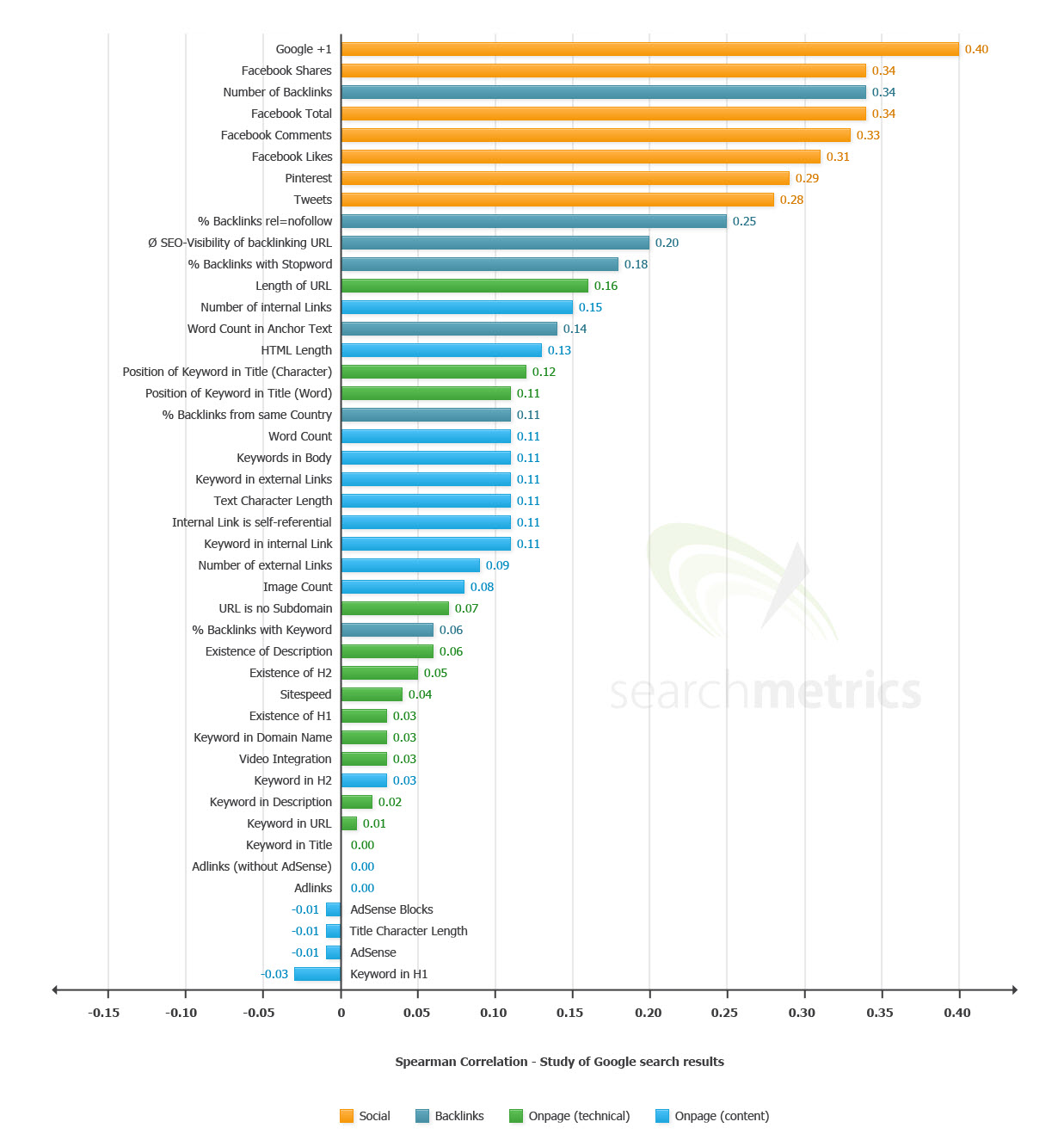 Some sites don’t add social sharing to their sites. Others do. Those who focus on social media may see thousands of likes while others who don’t won’t have any. The number of backlinks vary significantly, too. These same factors are all ranked highly on the correlation coefficient graph from Seachmetrics.com. Does this mean you should be trying to get more likes in order to improve your ranking?